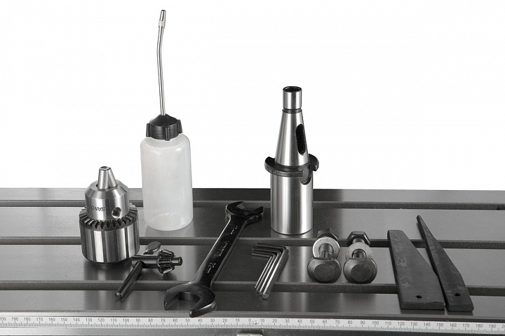 Фрезерно-сверлильный станок этой модели имеет конструкцию, рассчитанную на выполнение большого объема работы по обработке заготовок. Станок оснащен шпинделем с конусом ISO30 с зажимной тягой М12. Ход пиноли шпинделя составляет 120 мм. Станок обеспечивает нормальную работу с режущими инструментами, максимальный диаметр которых составляет при сверлении стали до 32 мм и чугуна до диаметра 45мм, при фрезеровании концевой фрезой до 32мм и торцевой фрезой до 80 мм. Оборудование позволяет осуществлять вращение шпинделя в обоих направлениях, вправо и влево. Наличие микрометрической подачи, позволяет установить инструмент на необходимую глубину в ручном режиме. Максимальный вылет пиноли шпинделя составляет 120 мм.