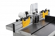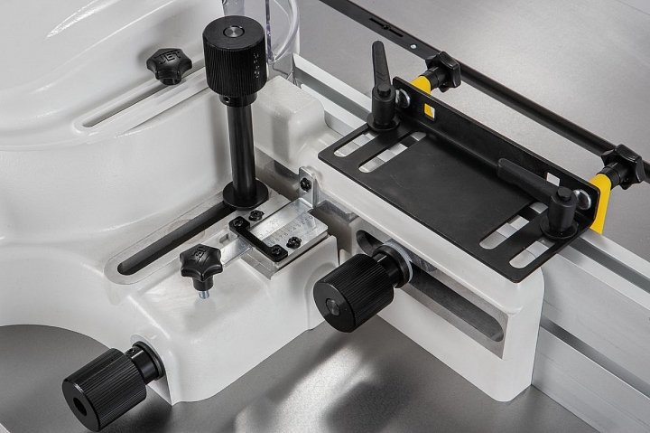 Фрезерный упор имеет усовершенствованную конструкцию с увеличенными накладками из алюминиевого профиля. Для регулировки его сдвигают целиком, ослабив два фиксатора. Винтовой механизм с миллиметровой шкалой позволяет отдельно настраивать положение задней накладки (величиной выступа регулируют глубину съёма). В качестве верхних прижимов заготовки используются пластиковые «гребёнки», в том числе страхующие от обратного выброса.