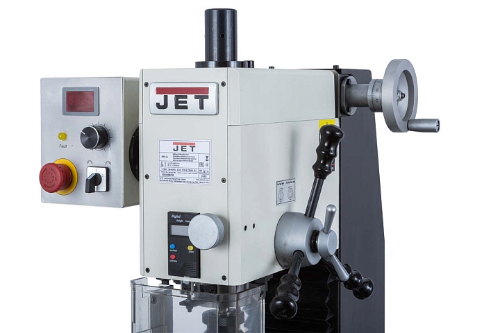 Моторная группа станка JMD-2L представлена коллекторным двигателем мощностью 750Вт. Управление работой двигателя осуществляется с панели управления, расположенного с левой стороны сверлильной головки. Двигатель имеет плавную регулировку частоты вращения. Диапазон частоты вращения составляет 100-2000 об/мин и регулируется потенциометром. Включение реверса осуществляется переключателем стороны вращения шпинделя.